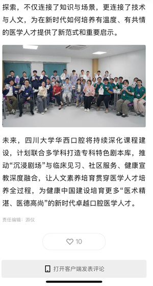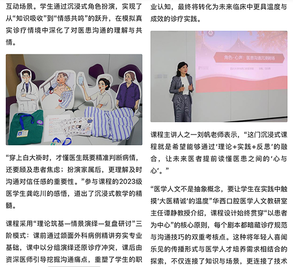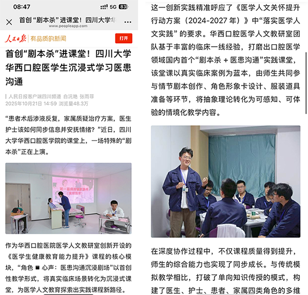 10月21日,人民日报客户端、人民网、四川观察等多家媒体报道我院首创“剧本杀”进课堂,口腔医学生沉浸式学习医患沟通。作为我院医学人文教研室创新开设的《医学生健康教育能力提升》课程的核心模块,“角色▪心声:医患沟通沉浸剧场”以首创性教学形式,将真实临床场景转化为沉浸式课堂,成为口腔医学领域国内首个“剧本杀 + 医患沟通”实践课堂,为医学人文教育探索出实践课程新路径。