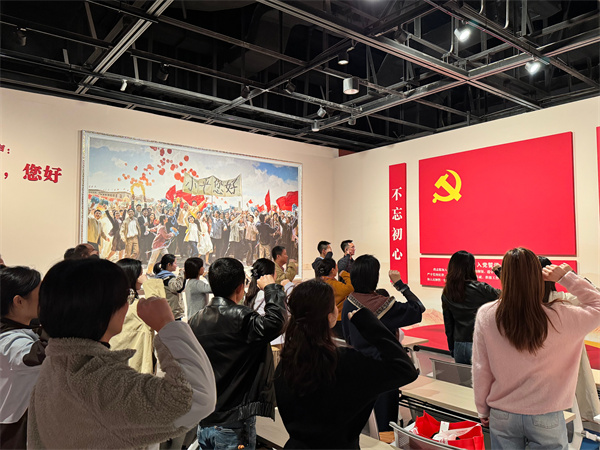 在讲解员引导下,两个支部党员依次参观“戎马生涯”、“走出广安”、“非常岁月”等展区,通过大量史料、影像与文献,深入了解邓小平同志在革命战争、改革开放和国家建设中的重要贡献。在展厅内“不忘初心、牢记使命”主题墙前,全体党员面向鲜红的党旗,庄严重温入党誓词。