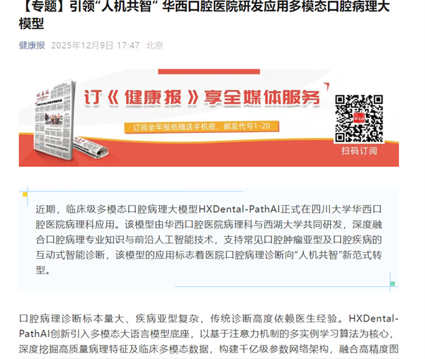 《健康报》《科技日报》、四川观察等多家媒体报道我院研发应用全球首个临床级多模态口腔病理大模型