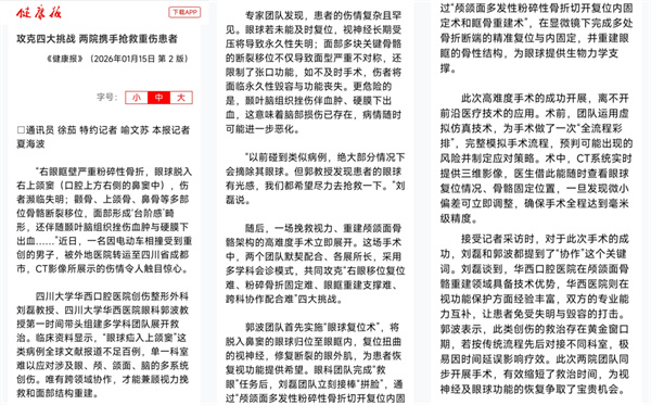近日,《健康报》、四川观察、红星新闻、成都日报、大众健康报等多家媒体报道我院与四川大学华西医院跨院协作,成功救治一例罕见多发创伤患者的医疗案例。患者因电动车相撞致右眼眶壁粉碎性骨折、眼球脱入上颌窦、颌面多处断裂及脑部损伤。此类病例全球报道不足百例,两院专家紧急组建多学科团队,借助术前虚拟仿真、术中实时CT导航等前沿技术,接力完成眼球复位、视神经修复与颅颌面骨骼重建,成功挽救患者视力、避免永久性毁容。本次手术的成功既彰显了跨院多学科协作的高效优势与我院颅颌面重建的技术实力,也为复杂创伤救治提供了实践参考。